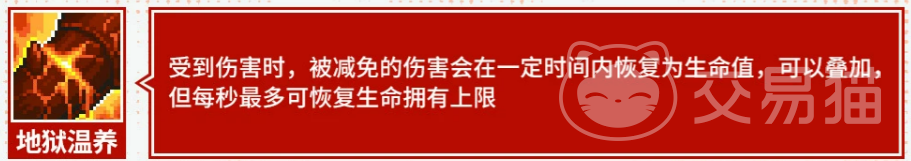 “地狱温养”提供间接续航支持:角色受到伤害时,所有被减伤效果抵消的部分,将在后续数秒内按比例转化为生命恢复;每秒恢复量设有上限,整体回血效率与减伤能力正相关,强化生存构建策略的多样性。