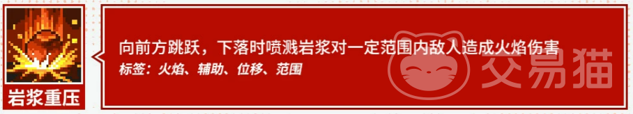 “岩浆重压”为突进型位移技:向前方跃击并重砸落地,瞬间在落点区域喷发岩浆,对范围内所有敌人造成火焰伤害。该技能兼顾机动性与AOE输出,既可切入敌阵核心,亦可在被围时快速反制,实战中具备较高战术自由度。