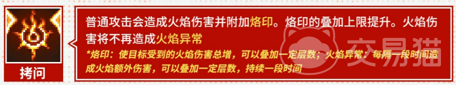 被动技能“拷问”重构普攻逻辑:每次普通攻击附加固定火焰伤害,并为目标施加一层烙印;烙印最大叠加层数获得提升;关键调整在于——该火焰伤害不再触发火焰异常状态,从而规避异常判定对输出连贯性的干扰,确保伤害输出更线性、更可控。