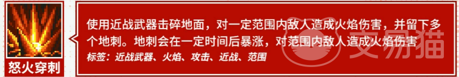 “怒火穿刺”具备延迟判定特性:持械猛击地面,生成数根潜伏地刺;短暂延迟后,地刺骤然爆起,对周围敌人施加二次火焰伤害。该技能兼具控场与持续威胁能力,适用于狭窄地形或密集敌群环境,形成有效战术布防。