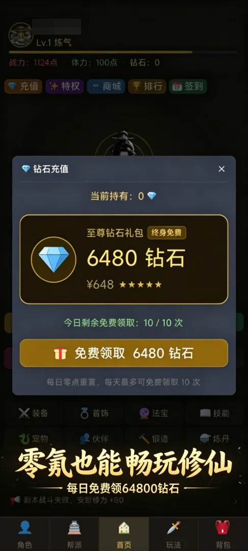 测试版本重点验证其核心机制——“零氪修仙系统”。玩家开局即可绑定该系统,后续全程无需充值,系统将按固定周期自动发放元宝与VIP经验,大幅降低成长门槛,提升长期游玩舒适度。