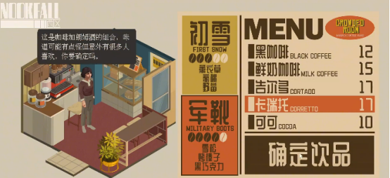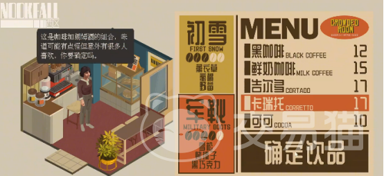 视觉层面,《NOOKFALL:西区》采用低饱和度复古配色与柔和手绘质感相结合的表现手法,构建出兼具怀旧气息与奇幻张力的城市图景。玩家可搭乘老式有轨电车穿行于街巷之间,在晨昏光影、雨雪天气及节庆装饰的交替变化中,感受同一空间在不同时序下的多重面貌。界面设计延续整体美学逻辑,例如饮品菜单模块即以实体价签形式呈现商品名称与标价,强化真实生活氛围。