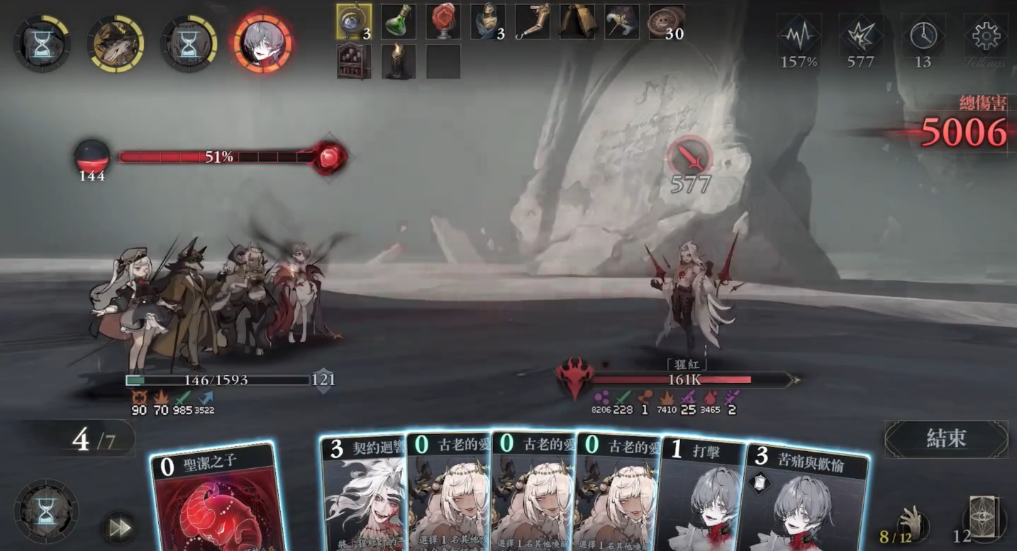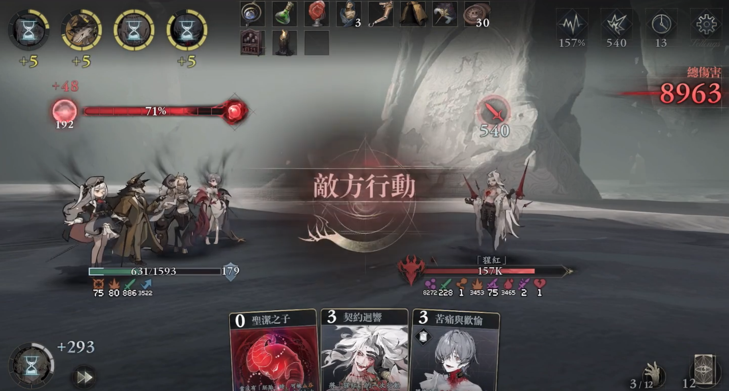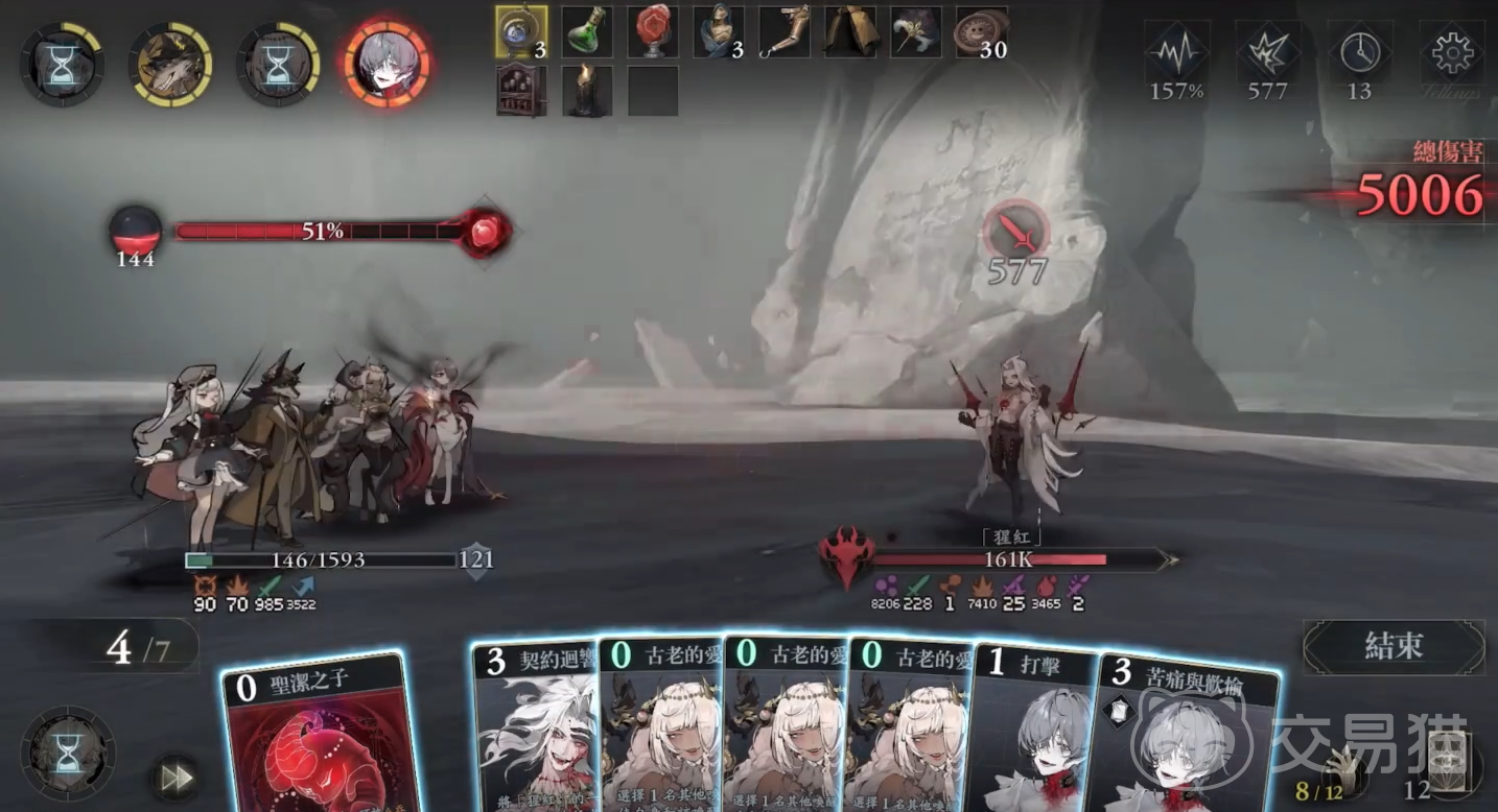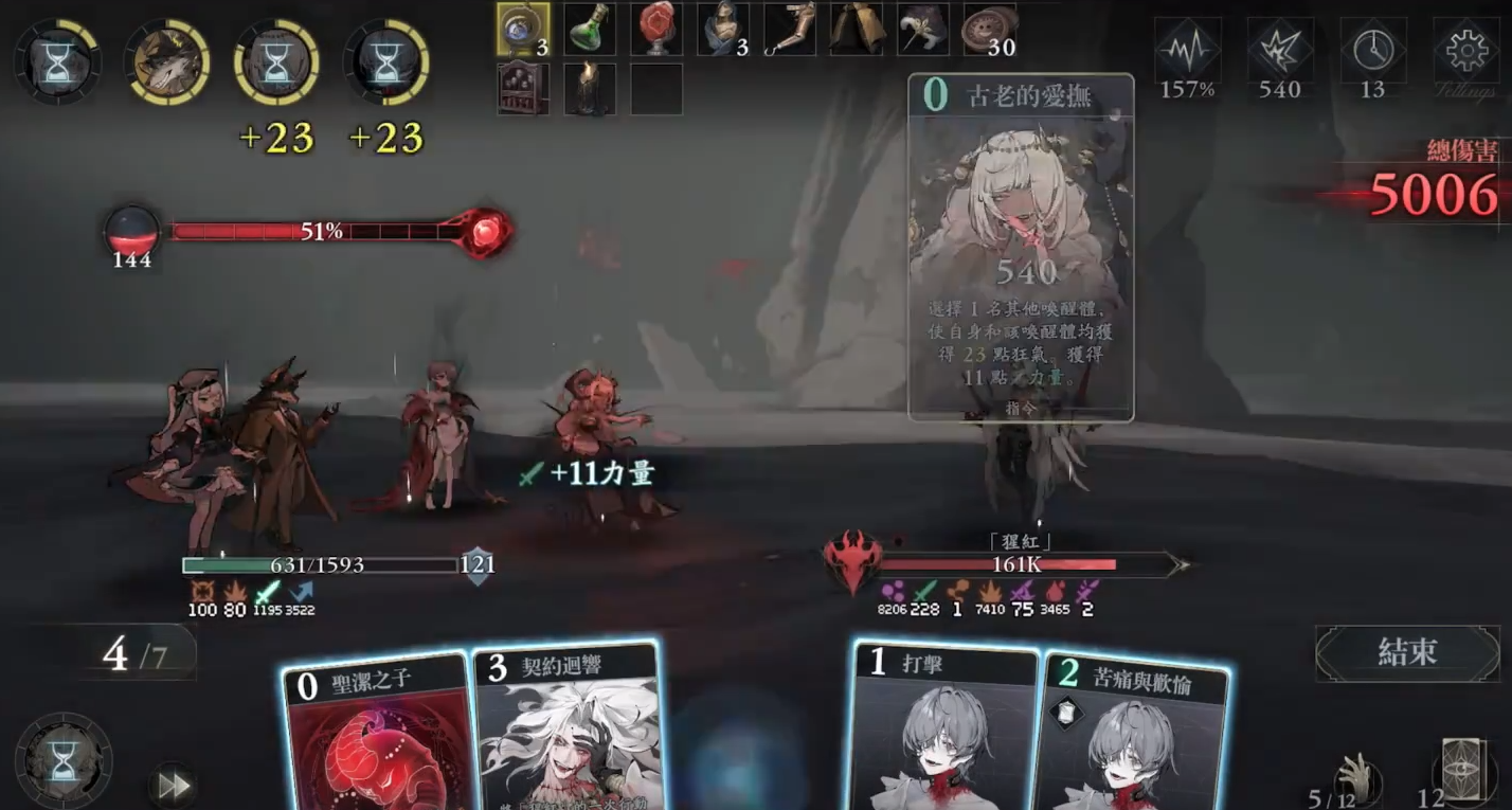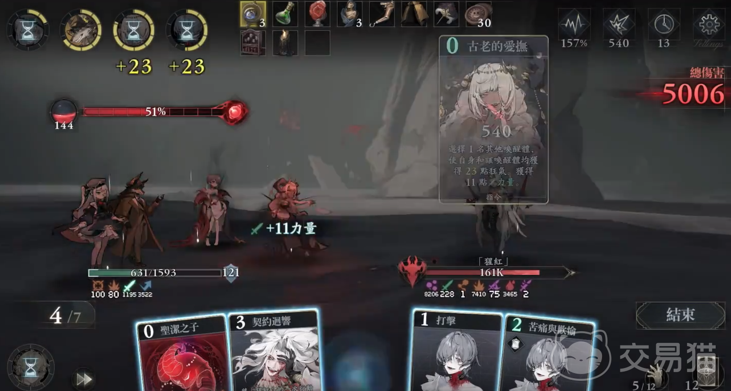 卡牌联动机制体现其策略性:使用打击卡可对目标造成攻击力10%点伤害,并积累5点狂气;防御卡则生成相当于防御力10%点的护盾,同步获取5点狂气;灵智觉醒卡直接赋予25点狂气,且每次打出卡牌均可推进胚胎融合进度15%。