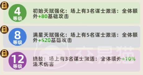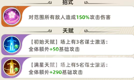 貂蝉的基础技能拥有150%攻击力的范围伤害,冷却时间为4秒。这一设定使其单体爆发节奏偏缓,但恰恰契合谋士队“重协同、强叠加”的运营逻辑。她的核心机制围绕“谋士数量”触发:当场上存在3名谋士时,激活初始天赋,为全体友方单位提供50点基础攻击力加成;当谋士数量提升至5名且貂蝉达到满星状态,该增益将跃升至290点基础攻击力——增幅幅度超过初始效果的5倍以上,是当前版本中单卡提供的最高档常驻群体攻击加成之一。