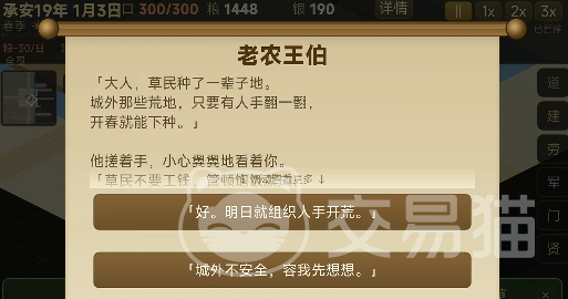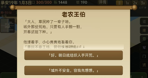 在治理过程中,玩家将持续面临多重路径选择:面对盗匪围城,可调集乡勇迎战,亦可暂缓修缮城墙转而囤积粮草;遭遇灾荒年景,能优先开仓赈济,也可推行以工代赈修建水利。每个选项均关联不同属性成长曲线,并影响后续剧情分支走向。