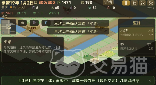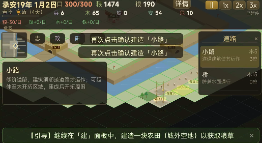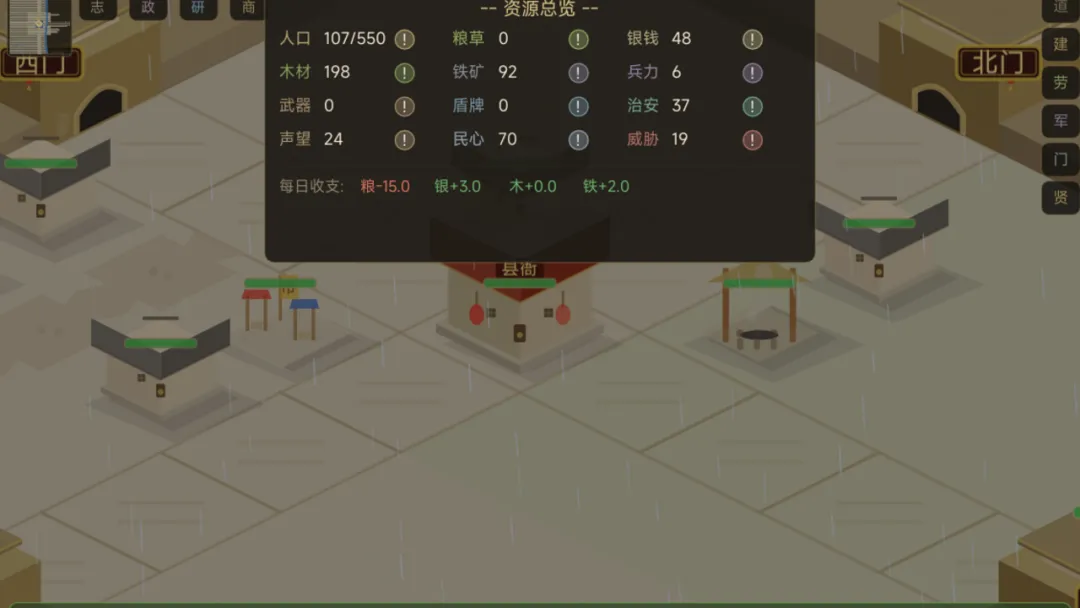 游戏核心玩法聚焦县域综合治理:需统筹农业垦殖、市集贸易、城防工事、道路运输与人口安置等多维系统。资源总量有限,任何单项过度投入都将引发连锁失衡——例如粮产不足将影响兵员征募,而军备松弛又会加剧流寇劫掠,进而阻碍商业复苏。所有决策均需结合实时数据反馈与动态事件触发机制审慎作出。
