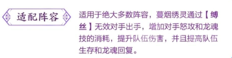 综合来看,蔓烟绣灵具备出色的环境适应性。其缚丝体系对敌方行动链形成结构性干扰,配合多维增益与元炁供给,大幅优化队伍资源循环效率。无论面对PVE副本挑战还是PVP高强度对抗,均能稳定发挥战术支点作用。推荐优先搭配需高频叠加元炁、依赖龙魂技打伤害或追求怒攻连发节奏的武将,以最大化其机制联动收益。