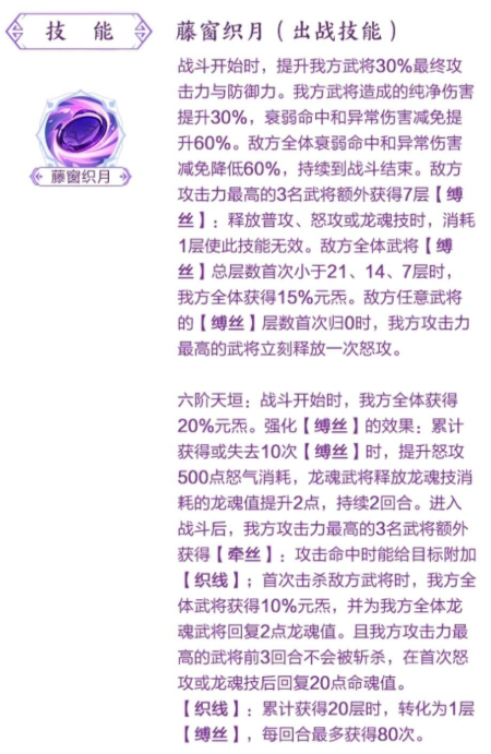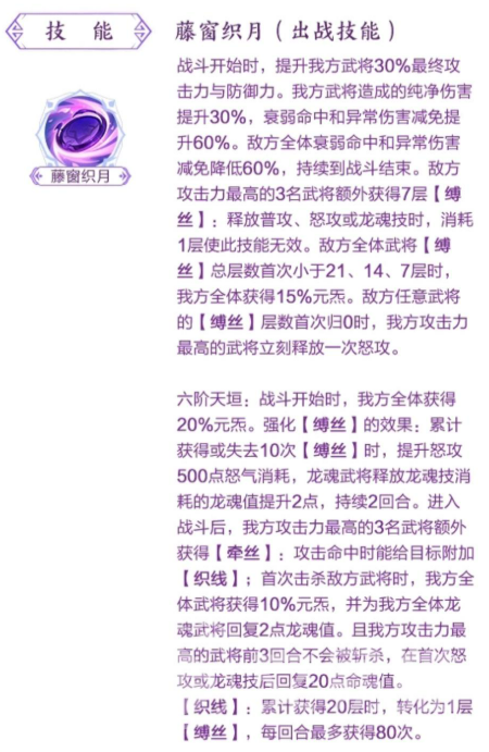 当任意敌方单位缚丝归零时,我方攻击力最高者立即释放一次怒攻。六阶天垣进一步强化其战略价值:开局即赋予全体20%元炁,并优化缚丝触发逻辑——每累计获得或失去10次缚丝,将使怒攻怒气消耗+500点、龙魂技消耗+2点,持续2回合。该设定可与高爆发武将深度协同,实现精准控场与瞬时输出跃升。