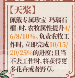 另一关键技能「天浆」需配合专属珍宝「玛瑙石榴」激活。装备后,不仅直接提升角色农牧属性,更可在任务启动瞬间完成部分进度——满级状态下可即时达成25%的工作量。尤为特别的是,当「福至」触发偏离行为时,其采集所得的花卉与野草数量将同步增加,形成一套自洽的补偿逻辑,使“不工作”亦具备策略价值。