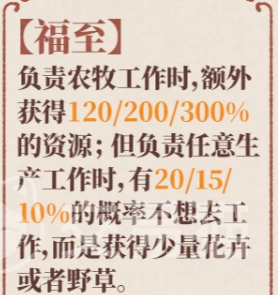 在游戏机制层面,榴见月为农牧专精型天级人物。其主动技能「福至」可使农牧类工作产出提升120%至300%,满级加成达上限值,显著强化粮食、桑麻、茶叶等基础资源获取效率。需注意的是,她在执行生产类任务时存在概率性偏离行为——即不进入工作状态,转而采集花卉或野草。该特性触发率随等级提升逐步降低,满级时稳定控制在10%以内,对纯农牧配置影响微弱,但若混搭其他生产类型建筑,则需合理规划排班以规避进度延误。