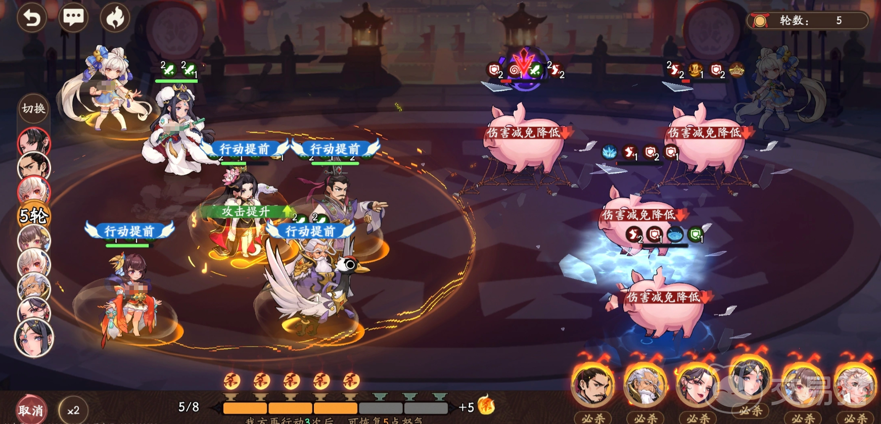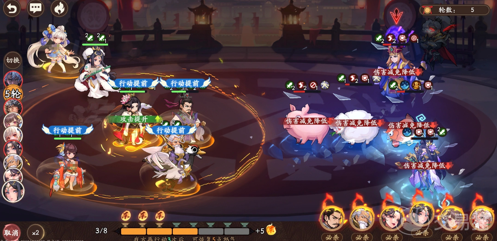 典型阵容示例:以蔡文姬(30%行动提前)+陈宫(30%行动提前)+何太后(强控+反制)为核心,补位左慈形成三层控制闭环。左慈可复制场上任意友方技能,当前复制成功率为30%;若搭配左侧天赋强化,基础控制命中率可提升至50%,并稳定覆盖2回合。该配置有效遏制敌方拉条武将的技能释放,保障我方行动链不被中断。