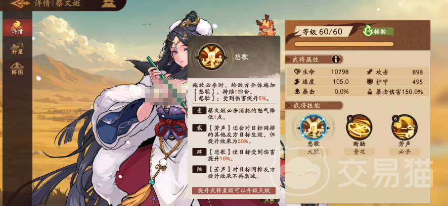 二星解锁天赋“芳声”,使“悲歌”技能效果可同步辐射至目标同排所有友方单位,提供50%的协同增益覆盖率;四星时,“悲歌”状态下的伤害增幅由5%提升至10%;六星则进一步强化“芳声”的稳定性——其右向传递效果不再衰减,确保增益链路完整延伸。需注意:“芳声”本质是蔡文姬必杀技触发的核心增益,兼具行动提前与输出强化双重功能。
