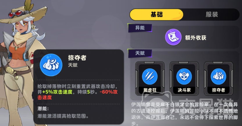 终局向天赋【掠夺者】则赋予伊莲娜极致的爆发节奏控制能力:每次拾取地面掉落物,均可立即重置当前近战武器的攻击冷却,并额外获得5%攻击速度加成,持续5秒。该效果可高频触发,显著压缩技能真空期;但需留意其负面代价——效果结束后将承受持续6秒的60%攻速惩罚。因此,该天赋适用于短时高强度压制场景(如Boss起手压制或小怪聚堆阶段),配合已解锁的回血类技能,可在攻速惩罚期前完成生存过渡,重新建立安全输出窗口。其潜能还可提升拾取范围,进一步优化资源回收效率。