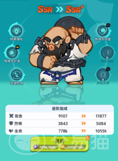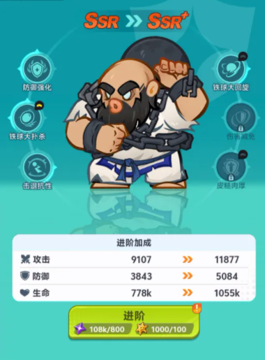 陈国汉属于典型的前排万金油角色,兼具承伤、保护与持续输出三重职能。其技能“铁球大回旋”虽削弱击退效果,但赋予自身免疫控制状态的战术优势;该技能发动后连续三次高速旋转,每次命中造成100%物理攻击力伤害,总计叠加至300%物理攻击力,覆盖周围扇形区域,特别适合应对密集站位的敌方阵容。