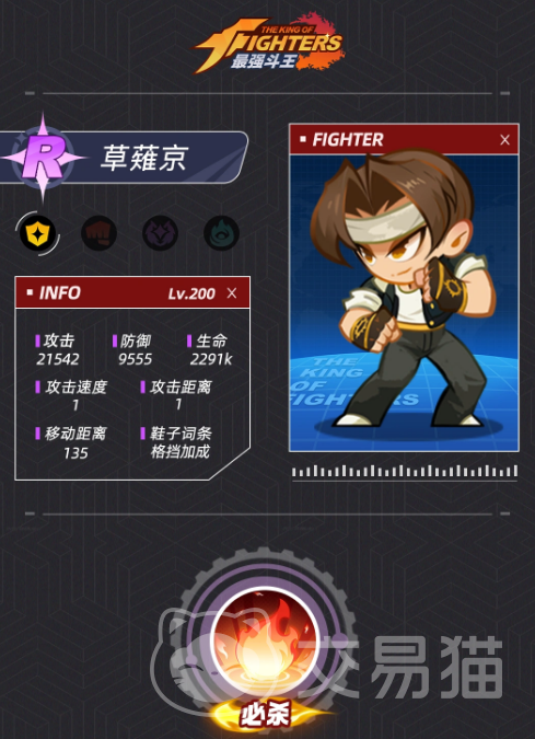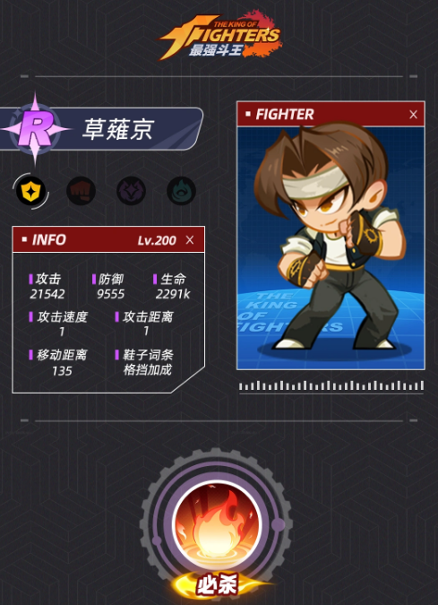 另一经典搭档草薙京亦可与东丈构建高效组合。草薙京虽初始战力偏重输出,但防御与续航略显不足;不过其成长曲线平滑,等级提升后物理伤害显著增强,并解锁小范围AOE效果。同时,生命值与格挡率同步上升,使其在中后期能更好承担前排承伤或侧翼策应任务,补足东丈在持久战中的短板。
