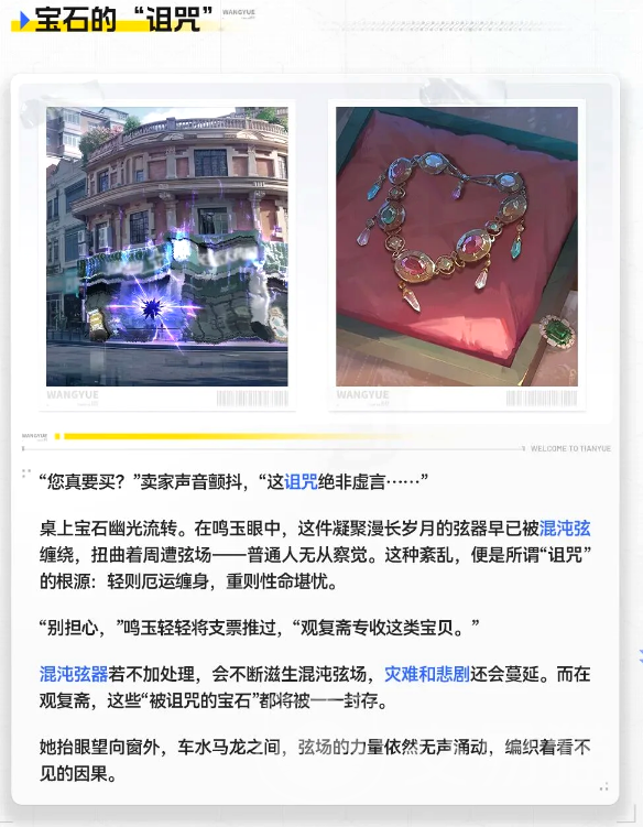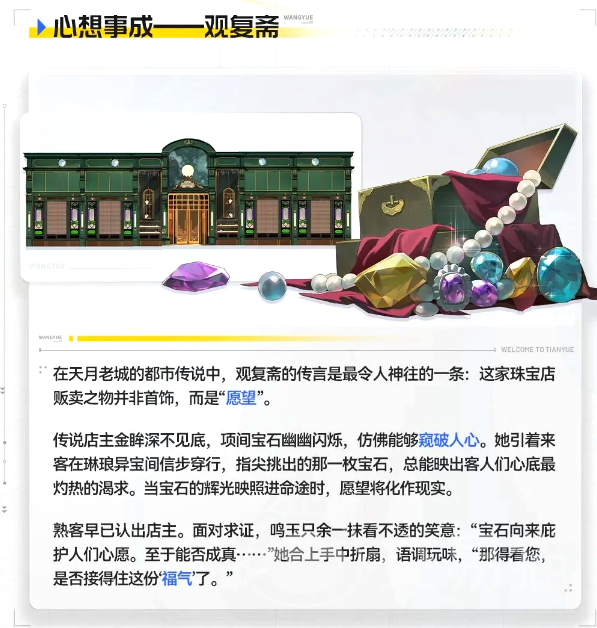 观复斋作为天悦城内一处关键人文坐标,其日常运营即体现鸣玉的核心能力——她可感知来访者内心最真实的愿望与情绪波动,并将其具象化为具有祝福效力的珠宝信物。这一过程融合了心愿解析、情感凝练与物质转化三重机制,因而被民间传颂为“许愿成真之术”。此外,净化能力亦构成其职业双轨之一:面对受污染或遭诅咒侵蚀的宝石类遗物,鸣玉能实施定向能量净化,阻断负面能量扩散路径,从而保障整座都市的安全边界不受侵蚀。
