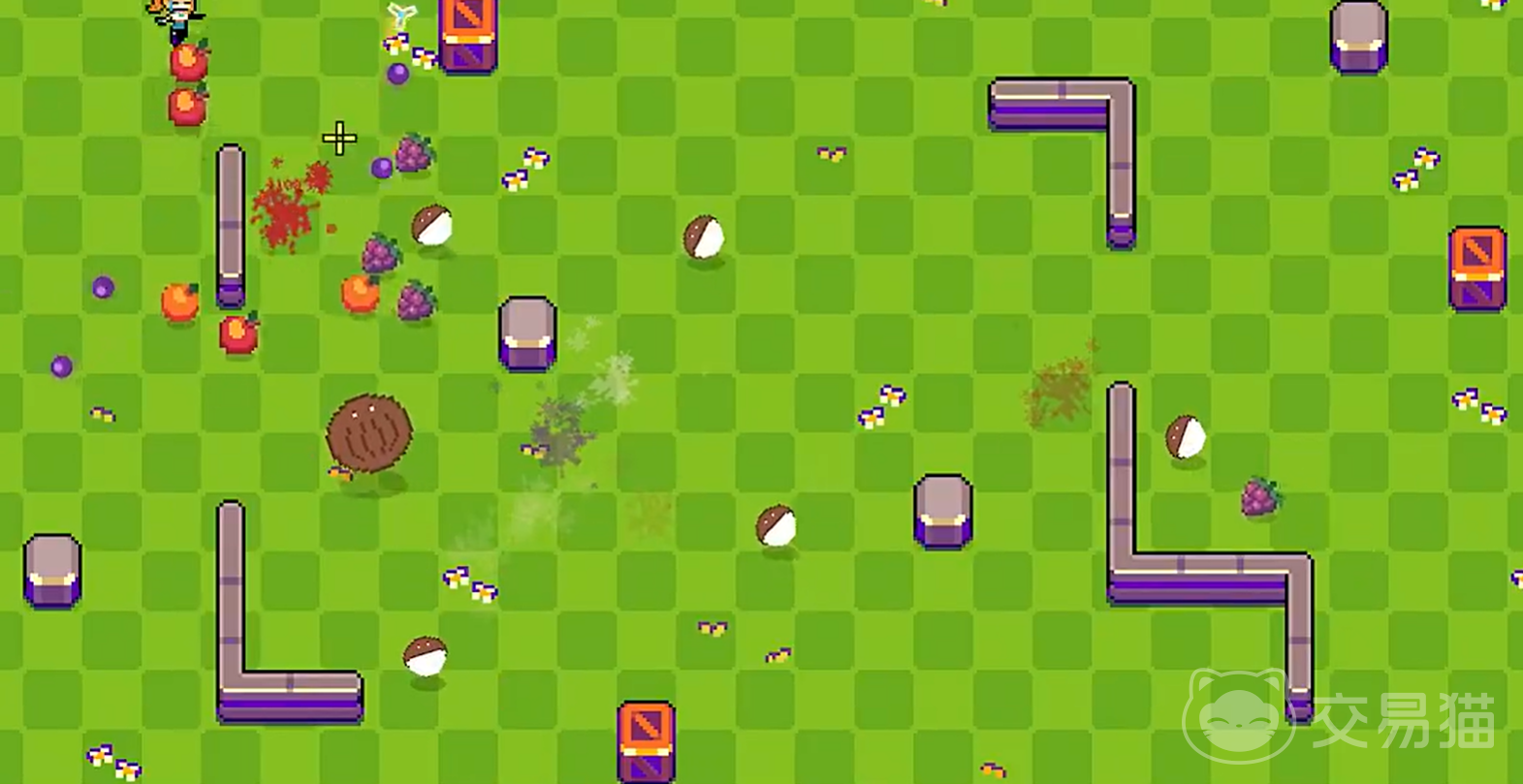 敌方设计兼顾趣味性与挑战性。常规敌人由苹果、香蕉、葡萄等拟人化水果构成,行动模式简单,易于应对。Boss战则大幅提高难度门槛:约10分钟时登场的巨型苹果Boss拥有999点血量,需耐心周旋;椰子Boss发动冲刺前会在地面预判显示白色虚线轨迹,务必及时横向规避;樱桃炸弹怪具备自爆机制,靠近玩家后启动倒计时,但成功击杀可触发全屏清除效果,成为逆转战局的关键手段。