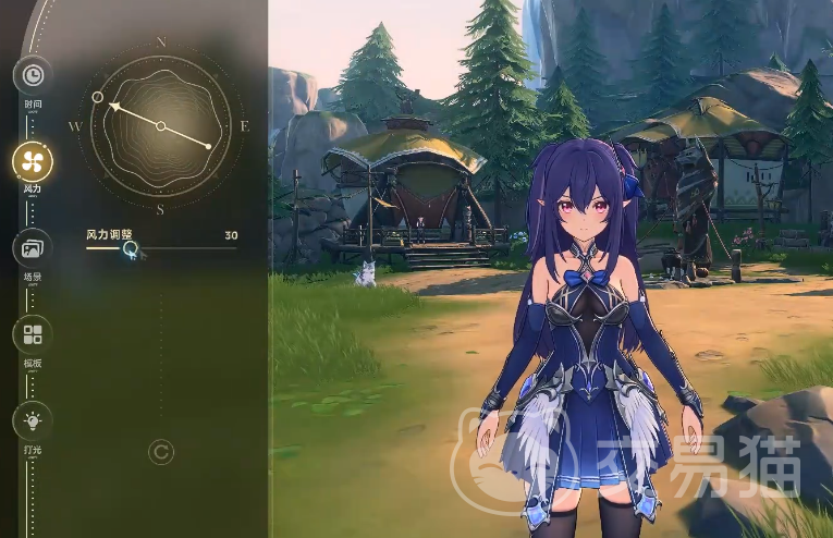 进入游戏后,相机入口位于界面左上角,轻点即可激活摄影模式。此时画面自动切换为第一人称取景视角,并浮现拟真相机UI界面。右侧滑杆用于精准控制镜头焦距与拍摄距离;左侧功能面板集成多项环境参数调节项:时间轴滑动可实时切换昼夜状态,无需等待系统自然更替,晨曦微光、正午晴空、暮色鎏金或星夜低垂皆可随心设定;风力强度调节则影响场景动态表现——增强风速后,角色发丝飘动、衣摆翻飞、草木摇曳等物理反馈同步增强,大幅提升画面真实感与叙事张力。