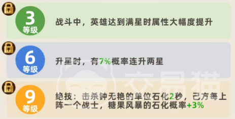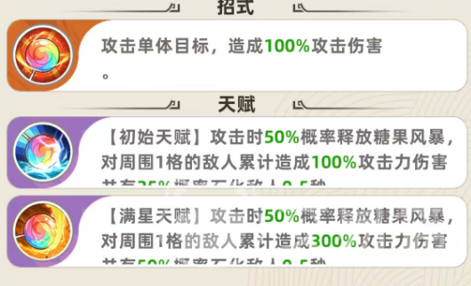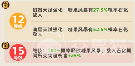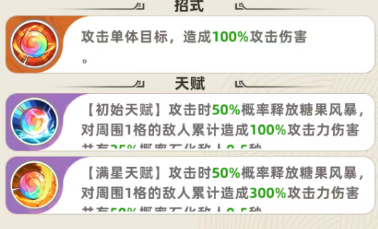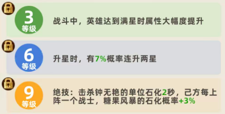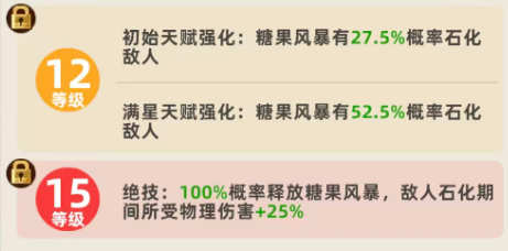 星级提升将显著强化该机制。满星后,“糖果风暴”的单次伤害倍率提升至300%,石化触发概率同步增至50%。尽管石化时长维持0.5秒不变,但概率翻倍大幅提升了控场稳定性。此外,等级成长路径需重点规划:建议至少升至3级以获取基础属性加成;升至9级后解锁被动退场技——被击杀瞬间,对全体敌人施加2秒石化效果,属高风险高回报的战略性反制手段。