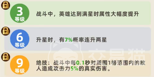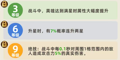 随着角色等级提升,庄周的机制逐步解锁并强化。达到3级后,属性成长幅度明显增加;6级开放升星功能,此时存在7%概率一次性连升两星,提升培养效率;9级解锁绝技——攻击频率提升至每0.1秒一次,仍为周围一格范围内的敌人施加攻击力5%的真实伤害,整体DPS较前期提升约三倍;12级时,天赋护盾效果获得强化:初始天赋下,自身护盾比例提升至19%,满星状态下则达38%,但友方谋士始终稳定享受200%攻击力护盾,不受等级影响。