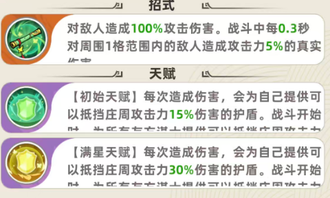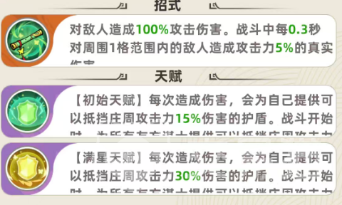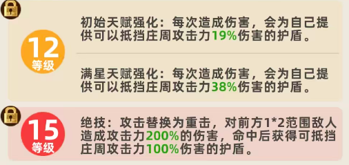 需注意的是,庄周的护盾强度与其实际输出量正相关——自身伤害越高,为全队提供的防御收益越显著。但其自身所获护盾数值(15%→满星30%)低于友方谋士固定享受的200%攻击力护盾,且后者在满星状态下保持恒定,不随星级提升而变化。因此,在资源分配上,优先将庄周升至满星可有效增强其单体承伤能力,从而延长其在前排的持续作战时间,进一步放大团队防护覆盖率。