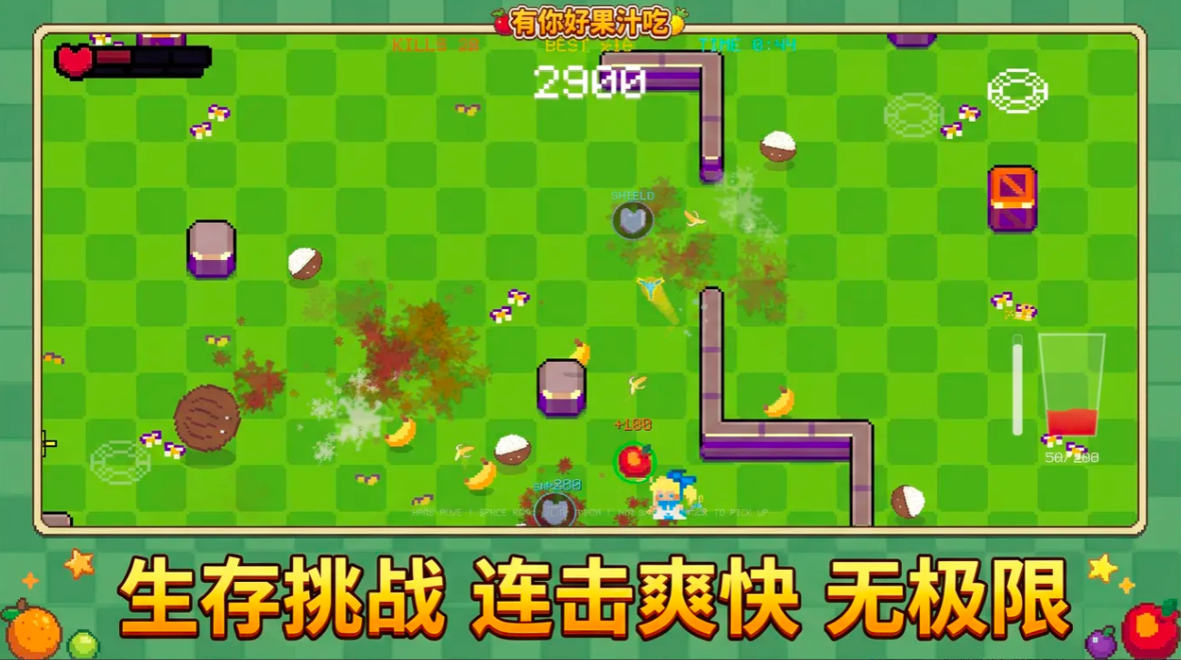 美术风格方面,游戏融合复古像素与现代漫画元素,构建出辨识度极高的视觉语言。水果小怪造型诙谐不惊悚,配合武器挥砍瞬间的果汁飞溅特效,强化了正向情绪反馈,显著降低重复刷关的心理负担。