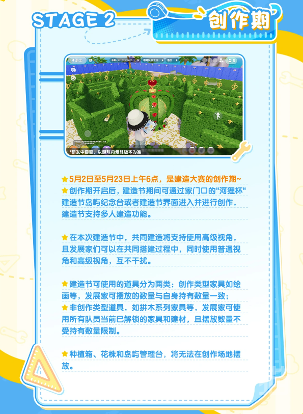 创作阶段自5月2日启动,持续至5月23日上午6点。玩家可通过家园门口的「河狸杯」建造节岛屿纪念台,或通过游戏内建造节专属页面,直接传送至独立岛屿开展搭建工作。本阶段支持多人实时协同建造,普通视角与高级视角可并行使用,互不干扰,显著提升团队协作效率与操作自由度。
