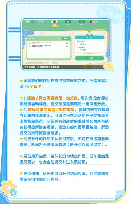 作品提交前须同时满足两项硬性要求:一是建造节系统评分须达指定基准线(每次保存编辑后将自动触发评分);二是队伍累计持有「新鲜的嫩芽」数量须达标。该货币仅限建造节内流通,可通过完成居民委托任务或出售物品获取。全队嫩芽数量为所有成员之和,因此招募高活跃度队友可有效加速资源积累。值得注意的是,作品承重值越高、结构越庞大,所需嫩芽数量亦随之增加,建议前期即有意识储备。