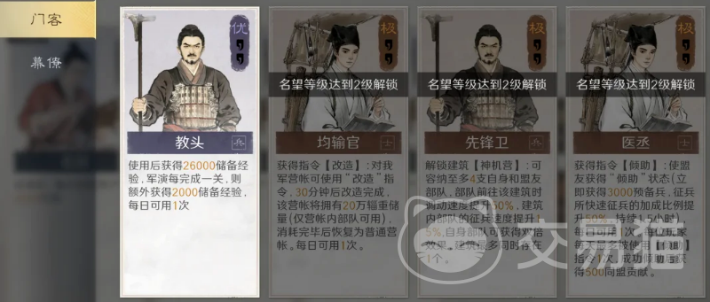门客组合需依赛季阶段动态调整。开服初期资源紧缺,推荐优先配置「役民」与「教头」:役民提升石料、木材、铁矿三类基础资源的每小时产出;教头则强化军演收益——每通关一关可额外获得储备经验。建议每日先完成全部军演关卡,再启用教头,确保经验收益最大化。