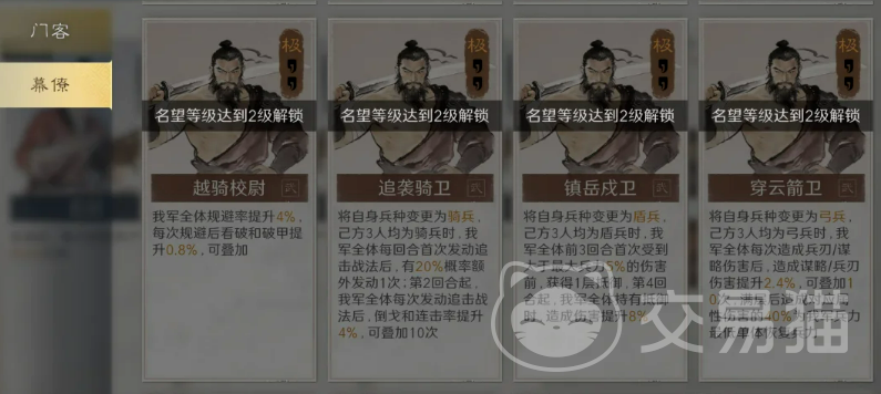幕僚强化路径分为三类:其一为兵种强化,支持武将切换兵种,并在同兵种编队时触发额外协同加成,适用于专注单一兵种体系的阵容构建;其二为技能强化,针对特定战法提供属性增幅,对已习得对应战法的武将效果显著;其三为通用强化,直接提升武将基础属性、规避率、伤害倍率等维度,泛用性强,适合缺乏明确方向时的基础配置。