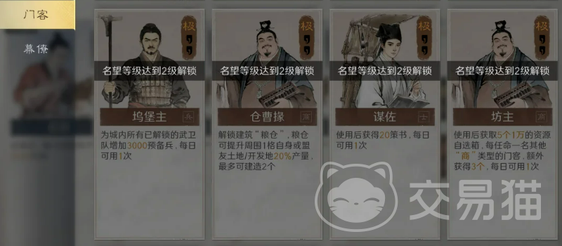 进入发育中期(约第4至第7天),建议引入「仓曹掾」。该门客解锁粮仓功能后,可使主城周边土地及开发地块的资源产量提升20%,显著加速资源积累效率。此阶段重心在于夯实发展基础,节奏平稳,重在持续性产出优化。
