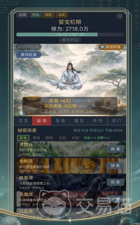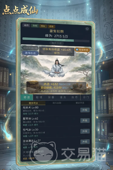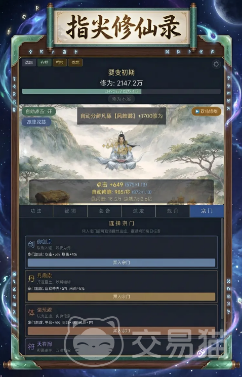在实际游玩过程中,游戏强调“点击+挂机”双轨成长逻辑:玩家通过修炼功法持续提升灵气获取效率,同时在修炼途中会随机触发奇缘事件——例如“仙人指路”可额外增加收益,“走火入魔”则带来阶段性风险,机制设计兼顾趣味性与策略权衡,显著增强修仙历程的真实感与不可预测性。