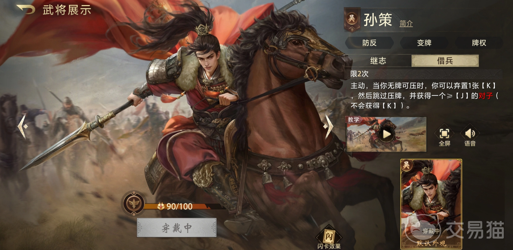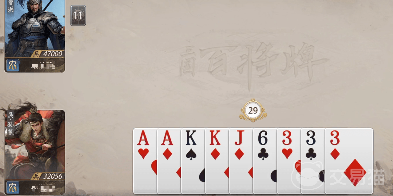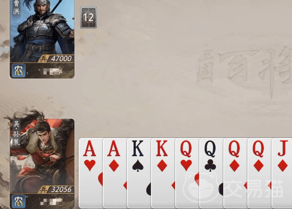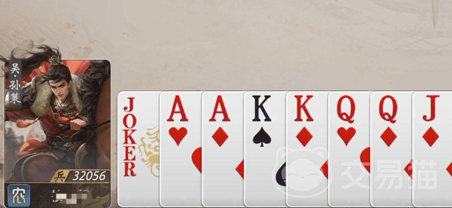 孙策拥有专属被动:开局自动将手牌中的K补足至3张。主动技能“借兵”则为其关键操作——当轮到自己压牌但无合法牌型可出时,可弃置当前手牌中点数最大的一张牌,跳过本回合压牌阶段,并随机获得一组点数≥J的对子(如JJ、QQ、KK、AA、小王对、大王对)。该技能不触发冷却,但需严格把握发动条件。