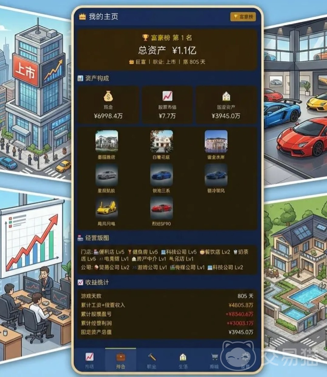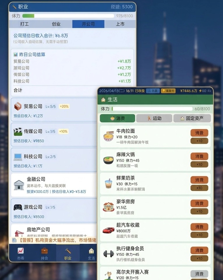 为增强策略深度与长期可玩性,游戏内置股票投资系统,支持多个行业板块的实时交易操作;同时引入动态事件机制,如政策调整、市场波动、突发事件等,使经营过程更具真实感和不确定性。此外,玩家还可推动旗下企业完成IPO上市,并参与全服富豪榜竞争,完整呈现从职场新人到商业领袖的成长路径。