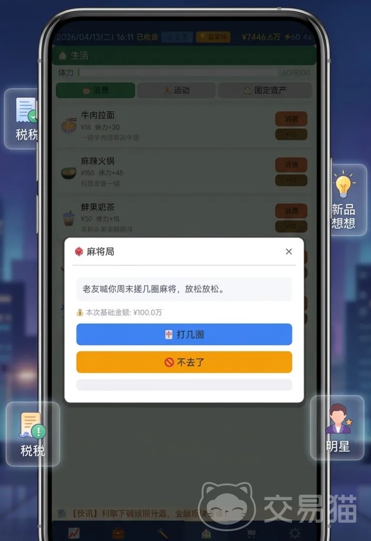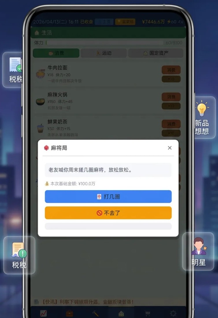 游戏中,玩家将从2004年出发,初始资金为10万元。前期可通过基础职业积累原始资本,随后逐步拓展商业版图:开设实体门店并持续升级,创办涵盖贸易、科技、游戏等多领域的公司,构建多元化收入结构,稳步扩大资产规模。