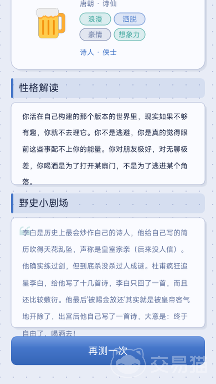 每位玩家获得的结果包含两部分深度内容:其一是个性化性格解析,语言平实生动,精准呼应答题逻辑,常令用户产生“这说的就是我”的共鸣;其二是原创野史小剧场,以轻松笔法还原历史人物鲜为人知的生活片段与思维细节,帮助玩家在娱乐中建立对历史的立体认知。
