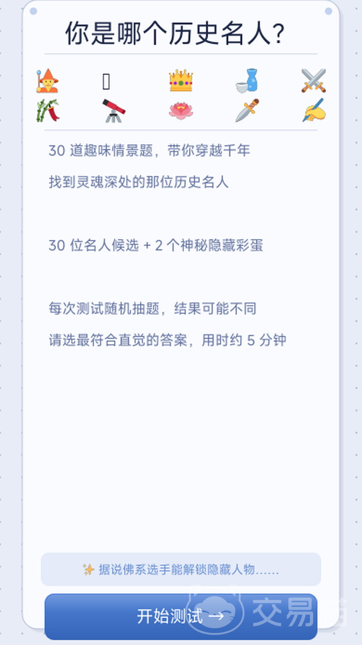 你与哪位历史人物最相似?这款趣味心理测评类手游轻松上手,无需繁琐操作,也无等级养成或战斗系统。玩家只需完成30道情境选择题,平均耗时约5分钟即可获得专属历史身份匹配结果,零基础用户也能即刻开始体验。