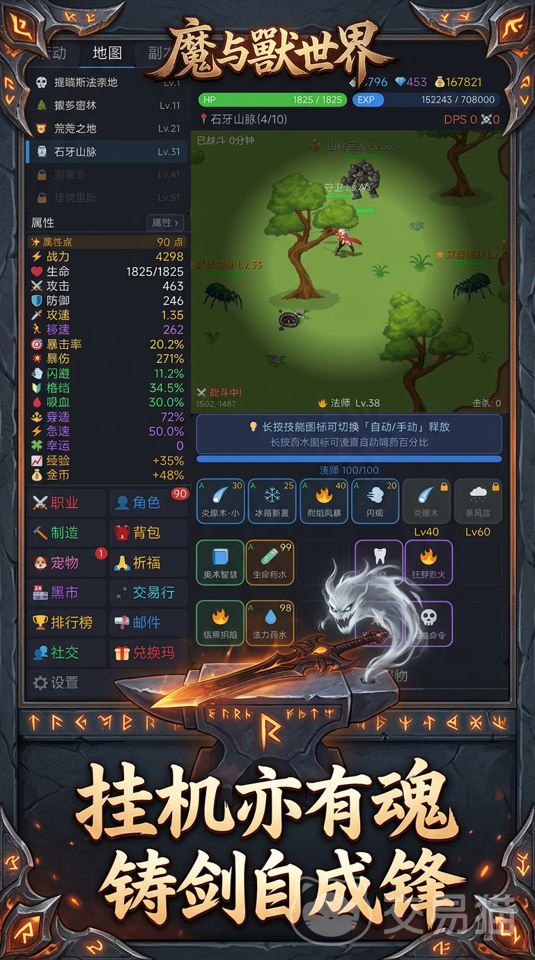 角色成长体系围绕三大支柱展开:角色本体、装备系统与宠物生态。等级提升主要依赖挂机收益、主线任务及副本挑战;升级后通过天赋树分配属性点,定向强化输出、防御或辅助能力。装备共设16个穿戴部位,掉落来源涵盖普通怪物、团队副本及世界BOSS,资源获取门槛较低,非付费玩家亦能稳定组建成型套装。此外,宝石镶嵌与玄铁铸魂两大强化模块可进一步叠加属性加成,助力战力高效跃升。