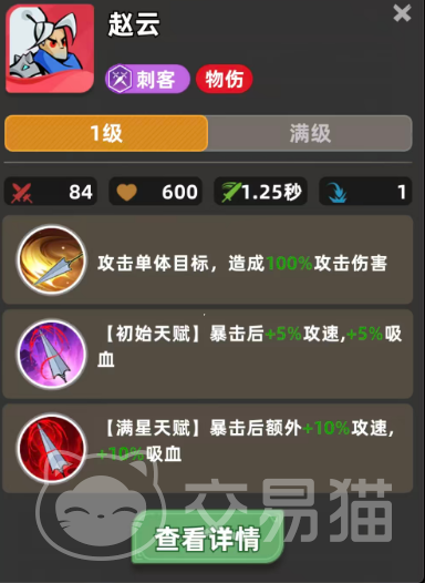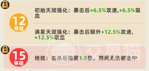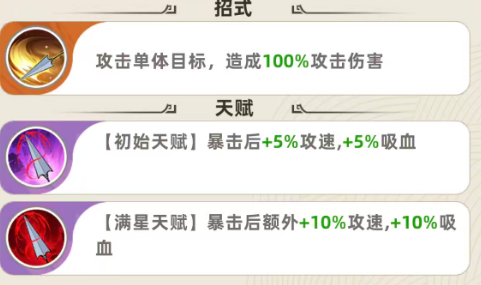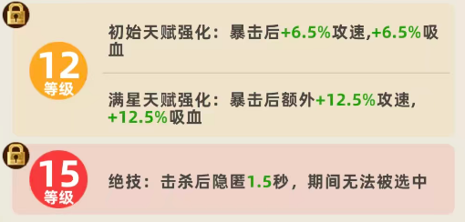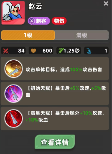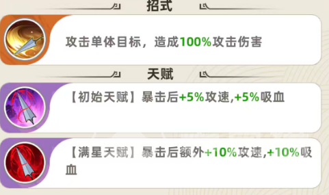 赵云的基础普攻附带100%攻击力的物理伤害,但真正决定其上限的是天赋机制:初始星级下,每次暴击可叠加5%攻速与5%吸血,持续生效。该效果虽单次增幅有限,却具备显著的滚雪球特性——随着暴击频率提升,攻速与续航同步增强,大幅缓解刺客常见的生存压力。尤其在缺乏专职治疗或护盾辅助的阵容中,这一吸血能力直接关系到赵云能否在切入后持续作战而非瞬间蒸发。