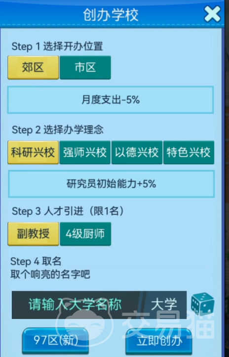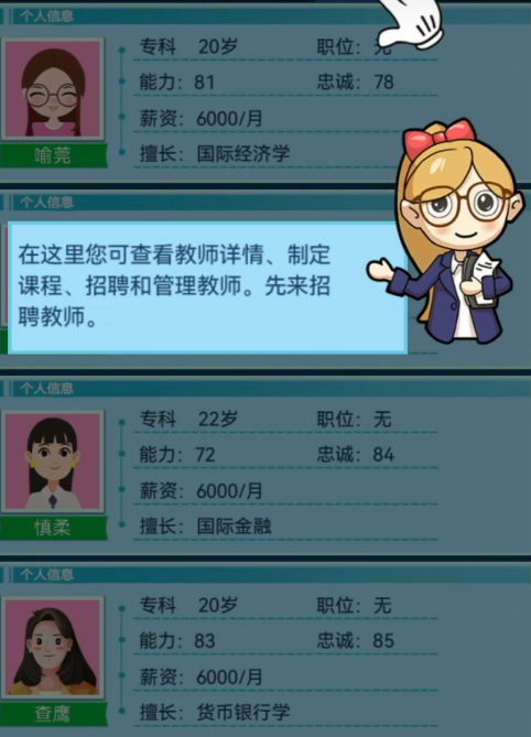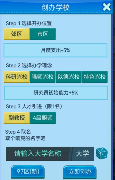 开局阶段需完成基础设定,包括校址选址、办学定位(如综合型/应用型/研究型)、初期人才引进策略等关键选项。确认后即进入引导流程,系统教学将分步讲解课程开设、教师聘任、学生培养周期、经费预算分配等核心模块的操作逻辑与底层规则。