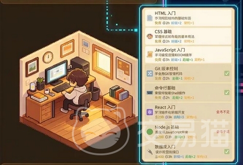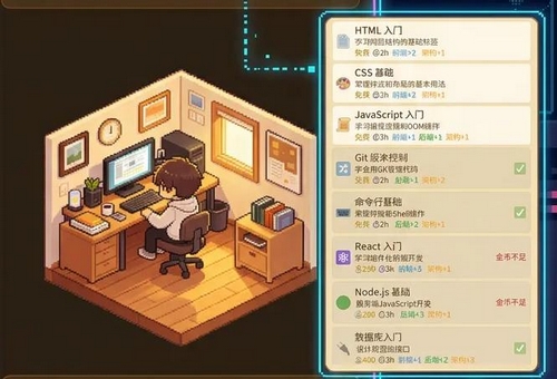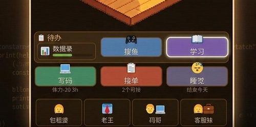 除核心工作循环外,游戏强调可持续发展逻辑:玩家可自主安排摸鱼时段,通过休闲游戏放松精神;选择在线课程模块系统学习新技术;或直接进入睡眠状态恢复体力上限。角色成长路径清晰——从初入行业的“码农”起步,逐步进阶为具备独立交付能力的技术骨干,最终达成个性化职业目标。