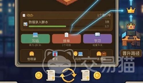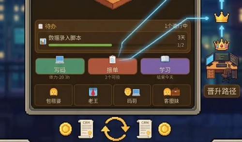 玩家初始身份为初级外包开发者,需在有限空间内处理客户委托、编写代码、提升段位等级。过程中需同步维系人际关系,尤其注重客户需求响应与交付质量管控。系统设有动态待办清单,每项任务执行均会消耗体力值并影响心情状态;持续高效履约可积累粉丝基数,为后续高阶订单与职业跃迁奠定基础。