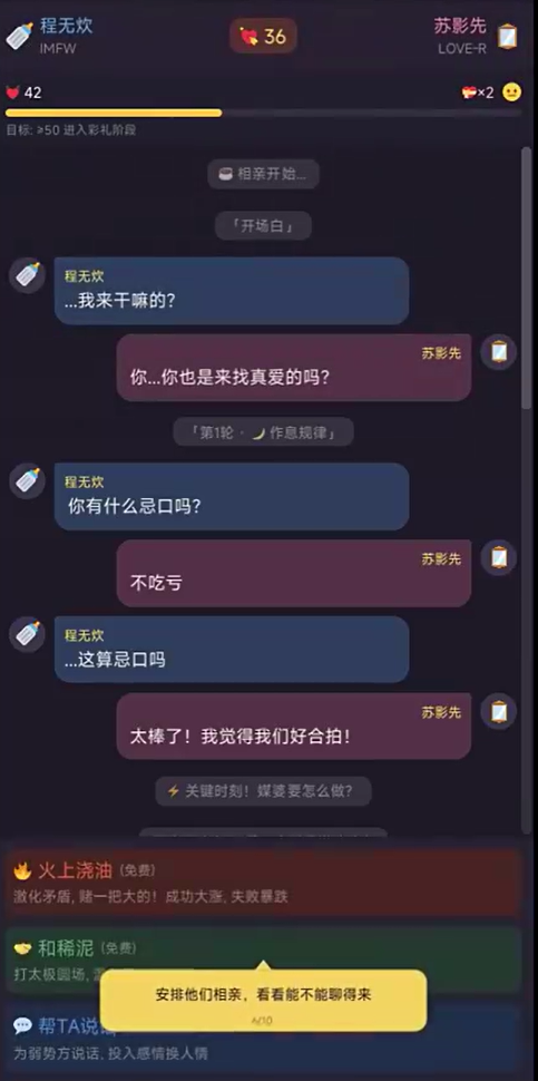 核心玩法“红线相亲”采用动态对话机制。双方自动展开交流,关键节点会弹出玩家选项。例如冷场时刻,可选择幽默化解或顺势推进话题;面对社恐型角色,则需优先降低其紧张值,否则全程将陷入无效沟通。每次操作同步影响两项关键指标:气氛值(低于阈值则相亲终止)与双方好感度(决定后续发展可能性),介入时机与方式需精准把控。