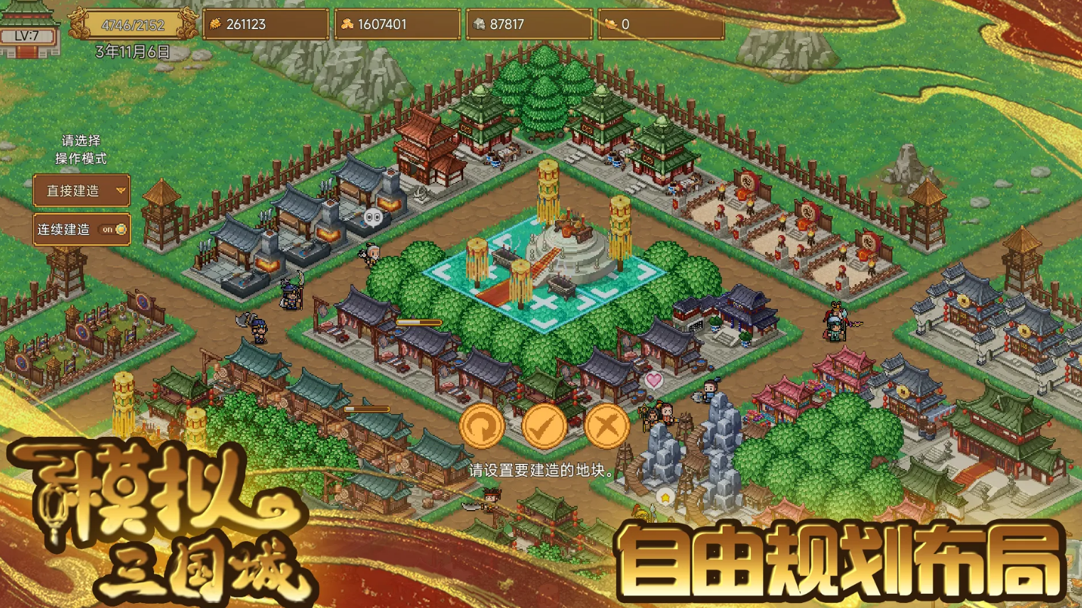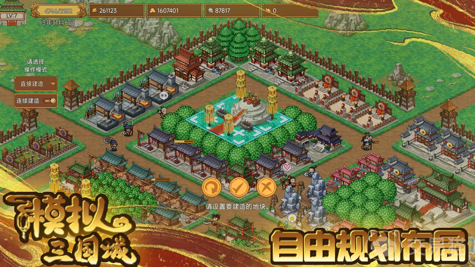 游戏以宏观沙盘视角展开建设进程:玩家从零开始规划主城功能区,通过建造农田维系粮草供给,设立市集提升资源产出,修建兵营强化军事力量。随着建筑等级提升与区域联动优化,荒原逐步演变为具备完整经济链与防御体系的三国重镇,成长反馈清晰直观。