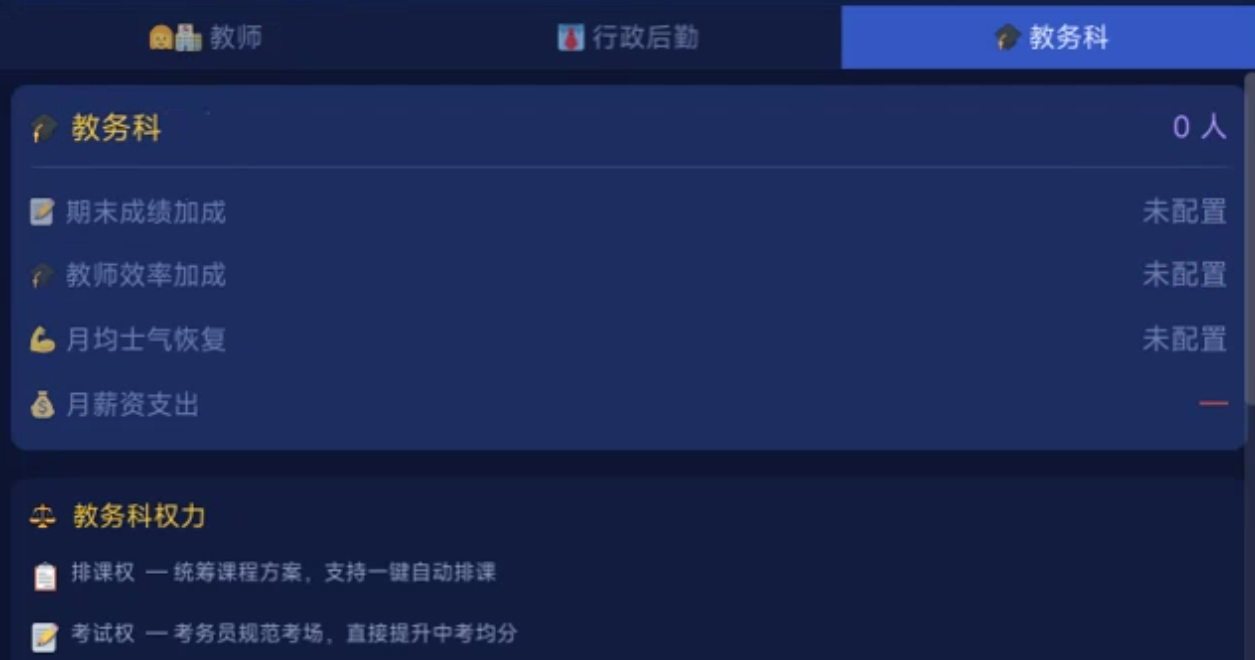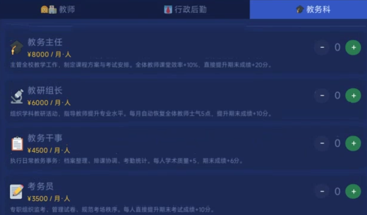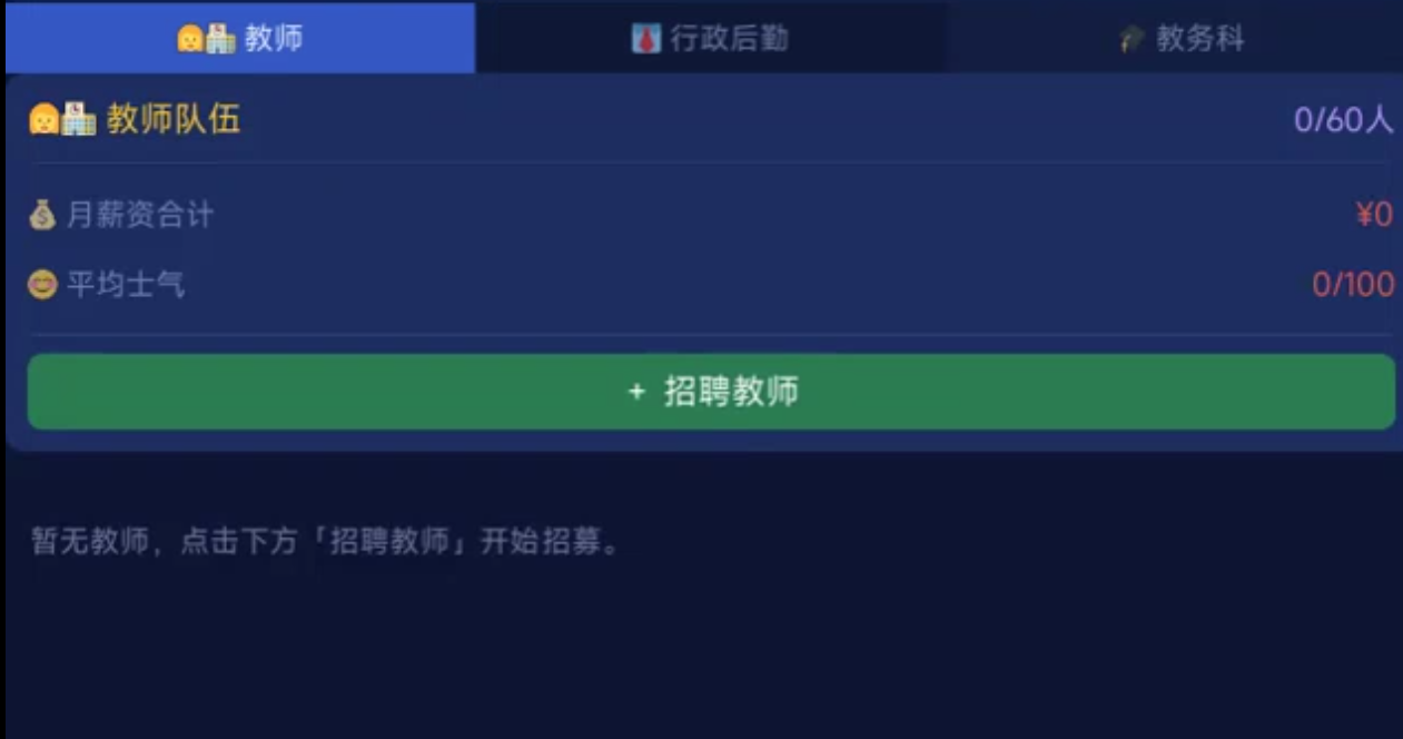 师资力量是影响教学质量与院校声誉的关键变量。玩家可通过教师进修计划、教研成果激励、名师引进等方式持续强化教学团队实力;在招生环节,需同步兼顾录取人数与学术门槛——设定差异化分数线,吸引高潜力学生群体,从而推动综合排名稳步上升。