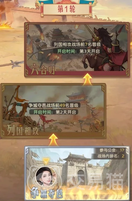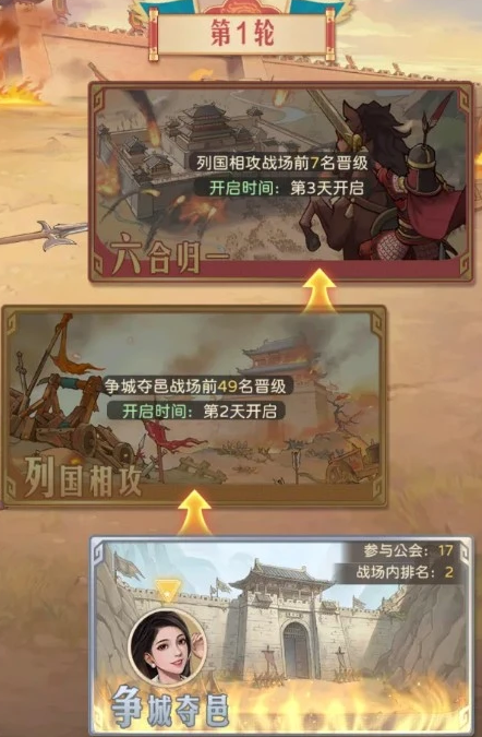 未获得参赛资格的玩家仍可参与外围互动,包括阵营竞猜等辅助玩法。每次活动开启前,系统将指定当日出战职业类型,对应角色的总属性值将按比例转化为战场基础战力。战场设有三级进阶体系,由低至高依次为:争城夺邑(初始级)、列国相攻(中级)、六合归一(高级)。所有公会均从“争城夺邑”起步,后续晋级依据实时积分与综合表现评定。