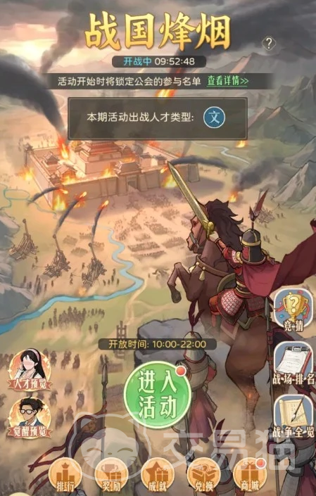 “战国烽烟”本质上是一场周期性公会战争,玩家将以诸侯身份统率所属势力,在动态沙盘中展开领土扩张与战略博弈。活动全程持续3日,每日开放时段为上午10点至晚间22点。采用自动报名机制——公会一旦确认参战,成员名单即被锁定;未在规定时间内完成报名的公会将无法进入当期战场。