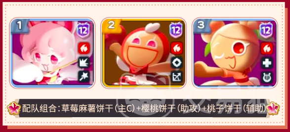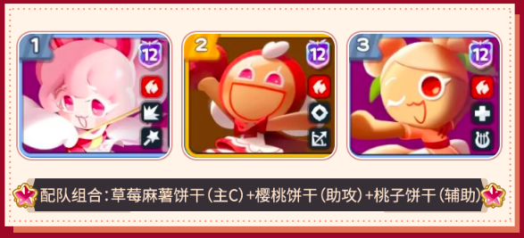 第三套为泛用性强的火系速攻体系:草莓麻薯饼干、樱桃饼干与桃子饼干。该组合主打“快速清场+持续灼烧+增益强化”三位一体策略。草莓麻薯饼干作为核心输出,可高效承接桃子饼干提供的攻击力加成,并在樱桃饼干的燃烧效果覆盖下,通过召唤物实现多波次连续打击,对Boss战与小怪群均有极强压制力,是极限通关模式下的优选方案。