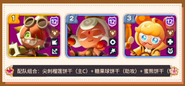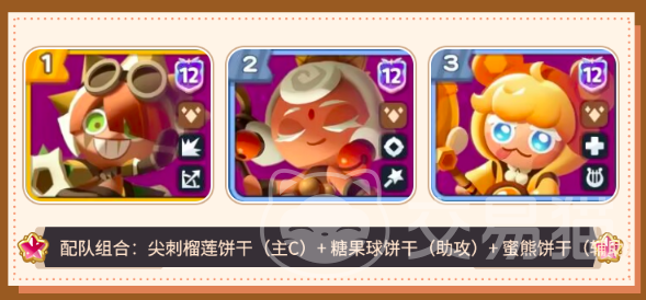 第二套推荐土系联动体系:尖刺榴莲饼干、糖果球饼干与蜜熊饼干。该阵容强调“状态叠加—区域控制—防御保障”的三层作战结构。尖刺榴莲饼干作为主C,可通过多段叠加机制触发高额群体爆发伤害;糖果球饼干负责构建持续生效的攻击区域,并同步削弱敌方防御属性,为后续输出铺平道路;蜜熊饼干提供全队护盾保护,在面对高频攻击或密集怪群时,大幅降低突发减员风险,整体攻防转换流畅,尤其适合应对高密度怪物场景。