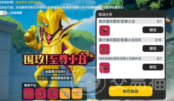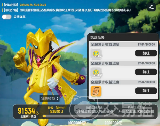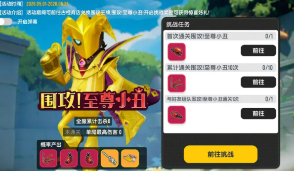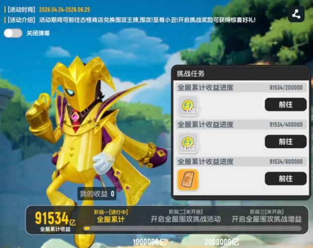 活动分为两个关键阶段:第一阶段为全服进度积累期,时间自4月24日起至6月25日止。在此期间,玩家参与“摸金派对”模式所获得的收益将实时计入服务器总进度。当全服累计收益达成设定阈值后,第二阶段——Boss挑战战——即刻激活。进度达成过程中,系统会根据阶段性里程碑发放肠宝币及核心凭证“围攻王牌”。该道具为进入Boss战的唯一入场券,未及时获取者可在古怪商店中使用其他资源进行等价兑换。